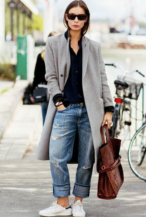 Мода этой осени стремится к простоте и комфорту. Поэтому, для того чтобы выглядеть стильно в этом сезоне достаточно лишь свободных джинсов, пары кед, рубашки и длинного серого пальто. Подобный наряд подойдет для воскресного шоппинга, прогулки в парке или похода в гости.