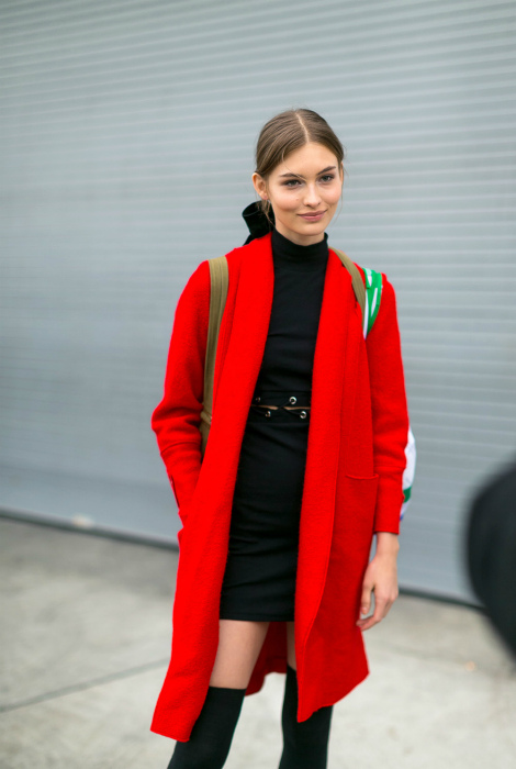 Красное пальто в сочетание с простым черным платьем футляром или брючным костюмом черного цвета - это беспроигрышный вариант на все случаи жизни.